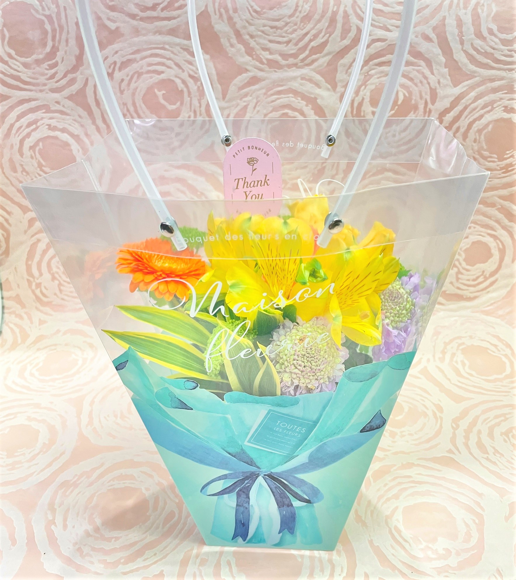 Happy Bouquet yellow Happy Bouquet yellow (b_mdy) Happy Bouquet yellow ¥3,300 大人可愛い花束を黒いプラスチックの花瓶に入れ、ラッピング柄の手提げに入れました。 花瓶も軽くお水替えも楽にできます。何とも素敵な仕上がりになりました! 商品サイズ:W20 H25 D15 使用花材:カーネーション・ガーベラ・ミニバラ・スカビオサ・アルストロメリア・ビバーナム・ソングオブインディオ ※仕入れ状況により使用花材(色など)が変わる場合がございます。 画像の商品イメージを損なわない様、作成に努めたいと思っております。